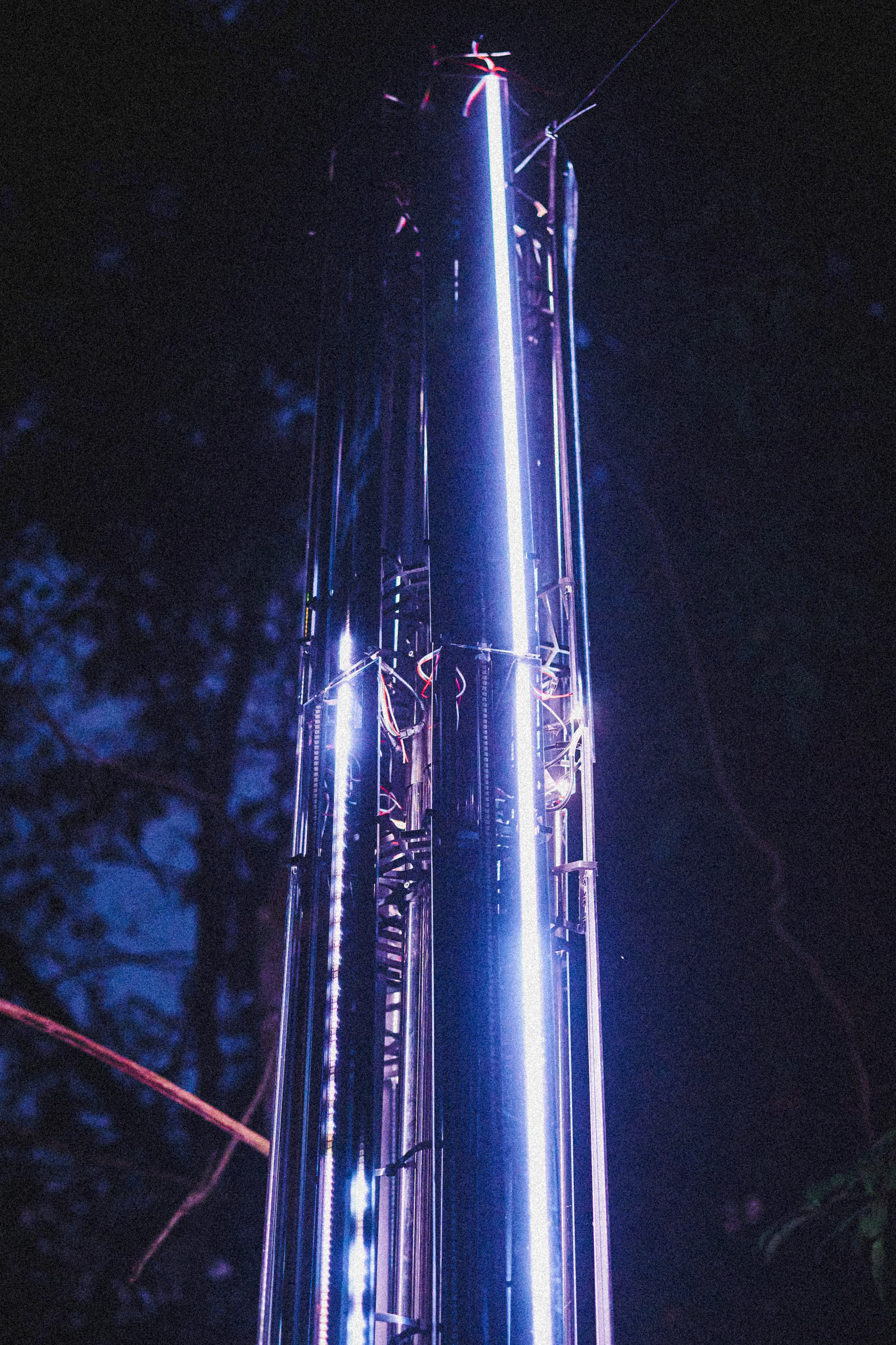 "The idea of The Pillar I comes from the form itself. Across various belief systems and metaphysical views, vertical forms—such as pillars, trees, or towers—suggest a connection between the physical world and the immaterial. This sculpture is built around that idea, to be portrayed as an ethereal artifact, blending into the environment in daylight and shining in the dark. Focus on creating a space for observation, inviting attendees to come closer and see themselves reflected in the panels. With the movement of the light, a person can watch how their form appears to shift."
